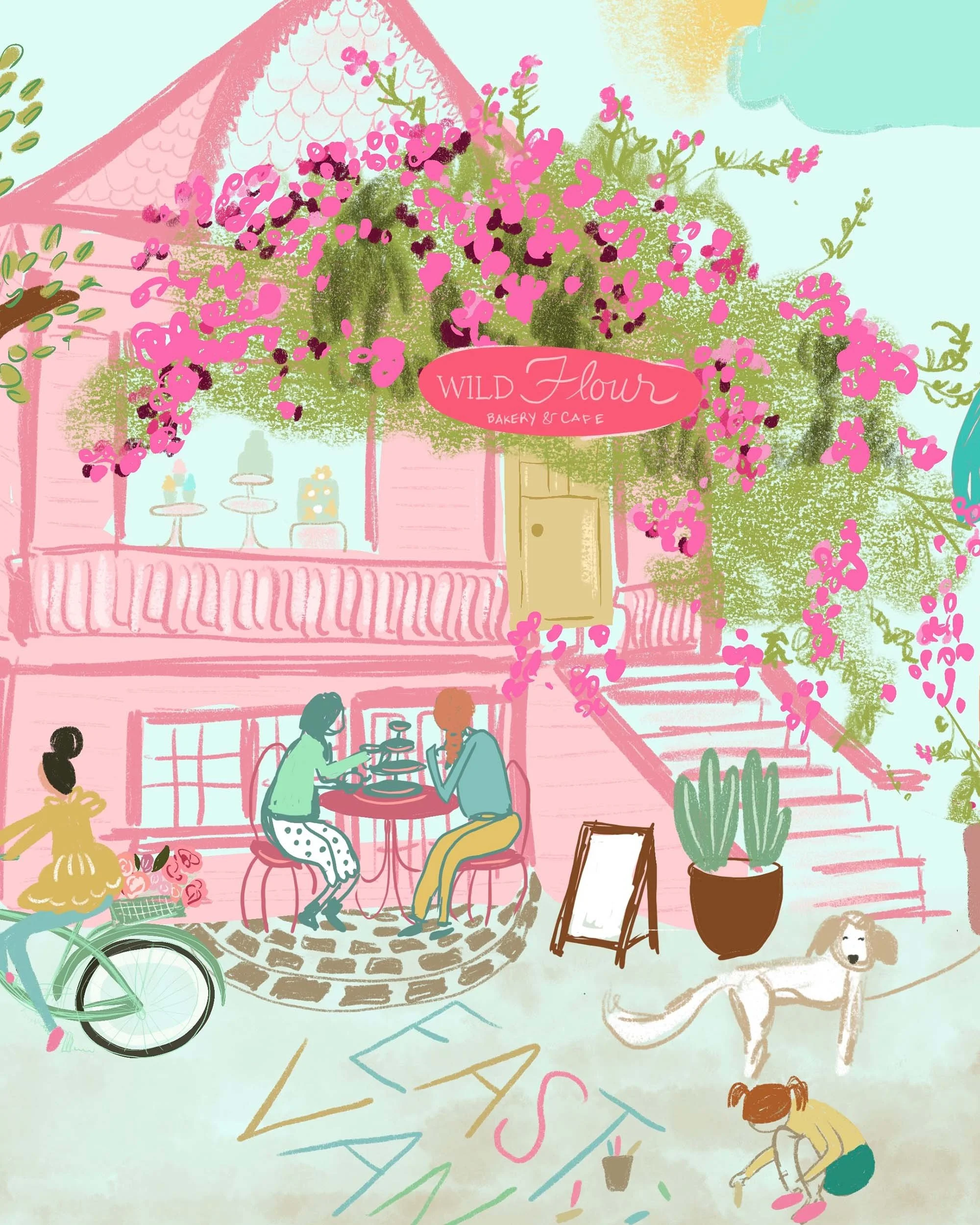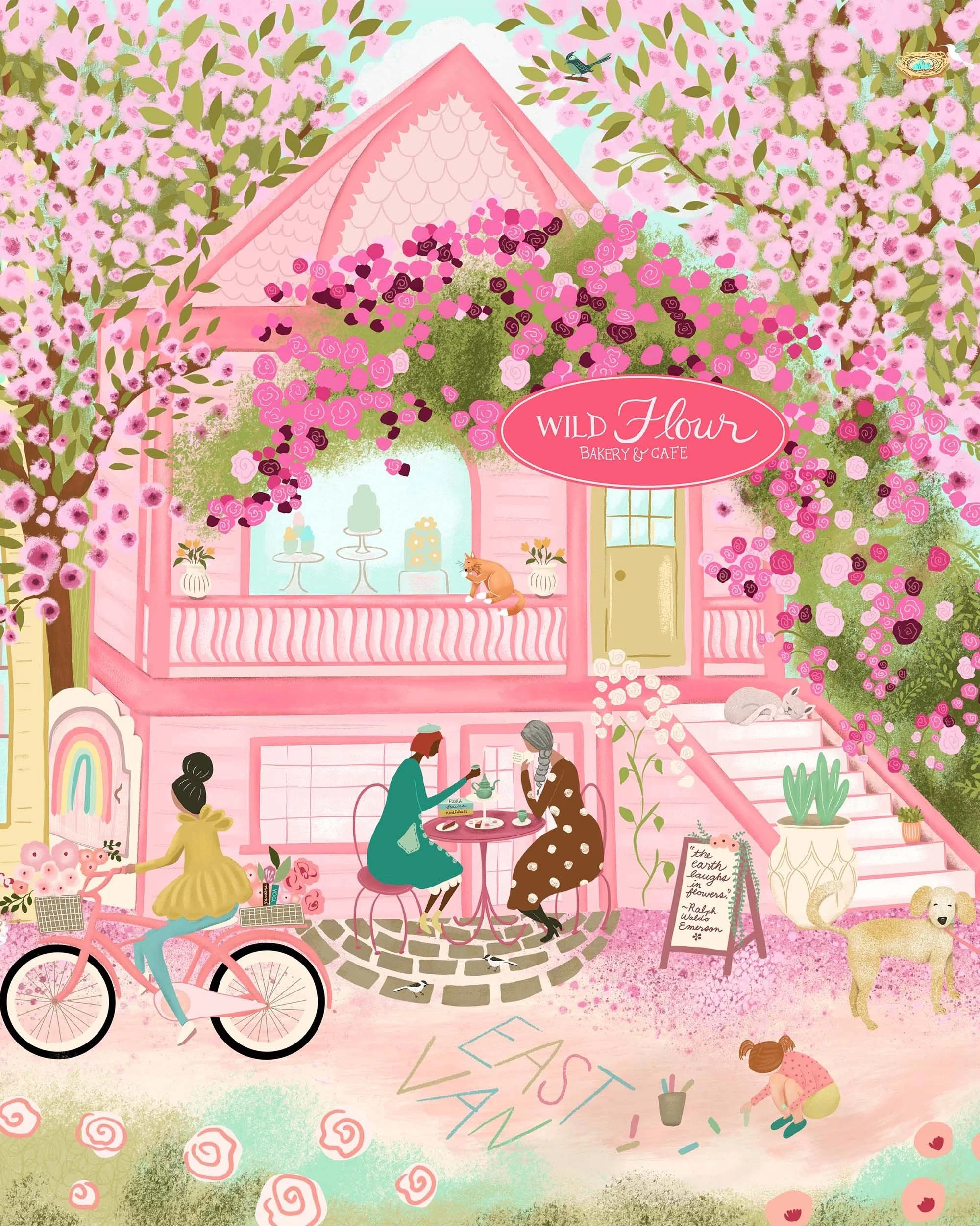 City in Bloom is a whimsical love letter to springtime in Vancouver — pink bikes, blooming streets, cozy cafés, and slow days imagined in pastel colours. Inspired by neighbourhood wanderings, and the simple beauty of supporting local, it captures an aspirational version of everyday life: the kind where you linger over tea with dear friends, wander tree-lined streets, and carry home flowers in your bike basket.