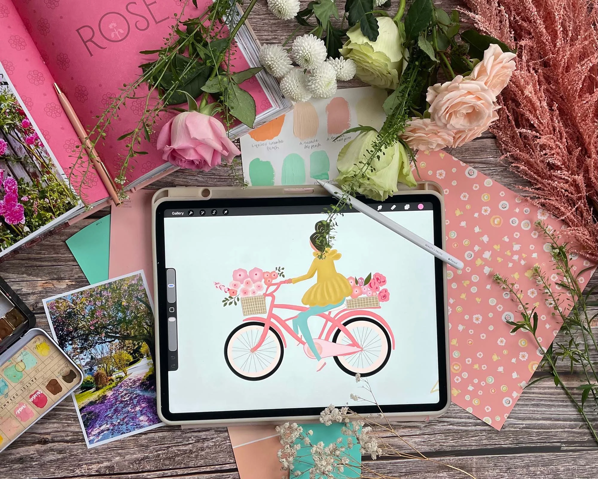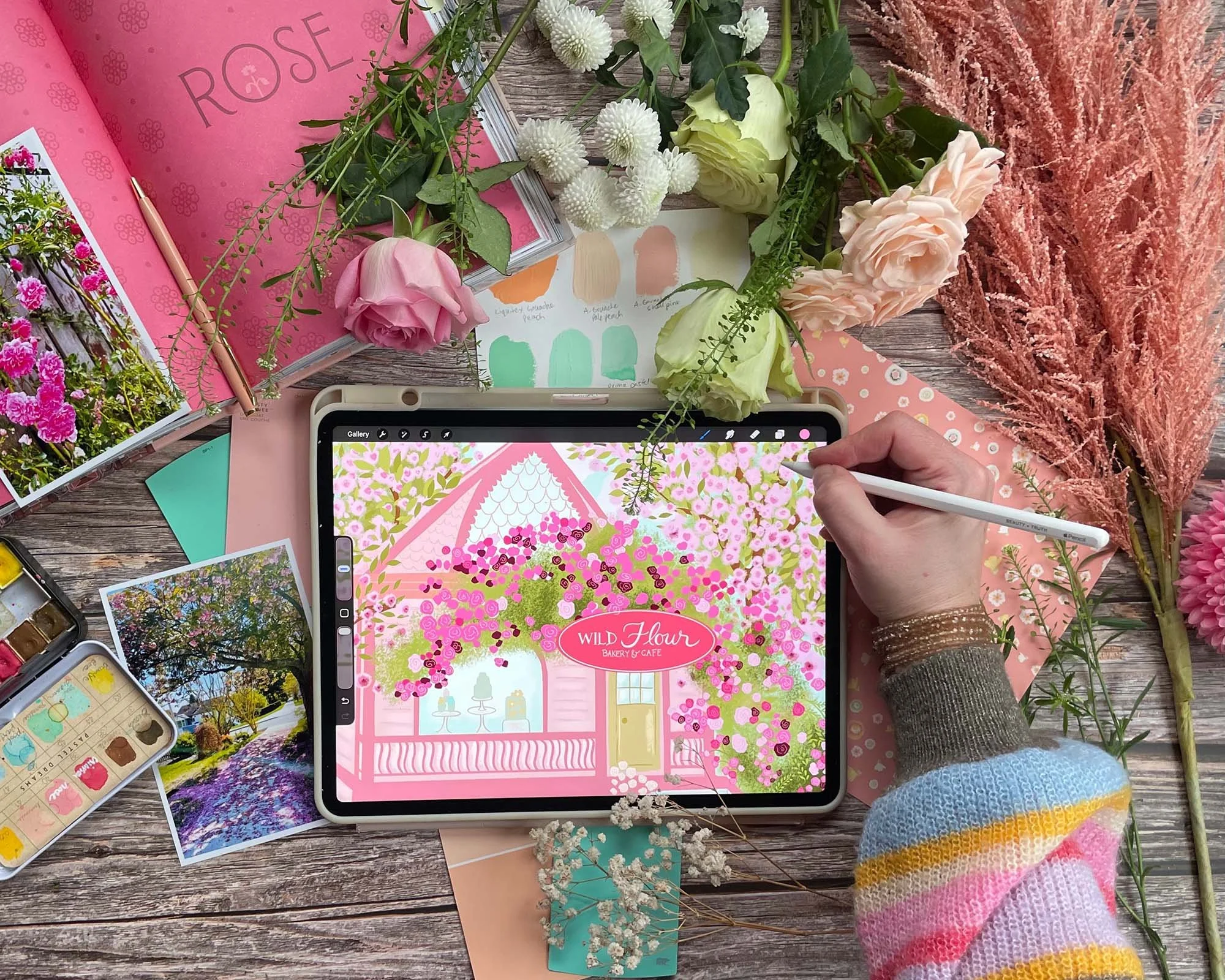 This piece was dreamed up in my cozy and bright attic studio—a sanctuary where paper, fabric, paints and half-finished ideas spill across every surface. I drew and painted digitally using Procreate on my iPad, sipped tea along the way, and paused for slow strolls through the neighbourhood. It became my ideal spring morning — blossoms drifting overhead, shop windows glowing, and neighbourhood life unfolding gently in bloom.