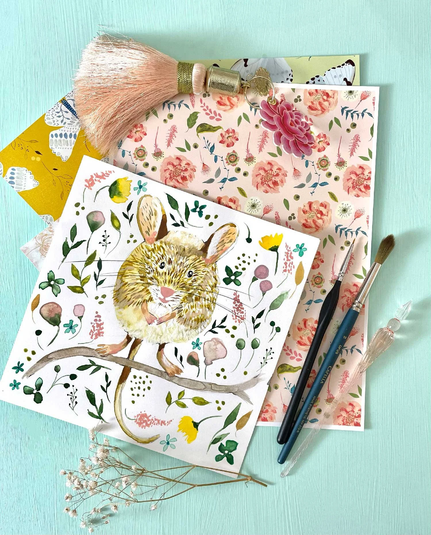 I created a YouTube tutorial for you! I show you how to create a whimsical and sweet field mouse in an afternoon, using watercolour & gouache. I show you all the steps—including creating a mood board, palette, supplies overview, and a demonstration of the painting process. Come sip your tea and spend an afternoon painting with me. At the end you will have a finished illustration to hang on your wall, or ready for you to turn into a design or pattern for licensing.