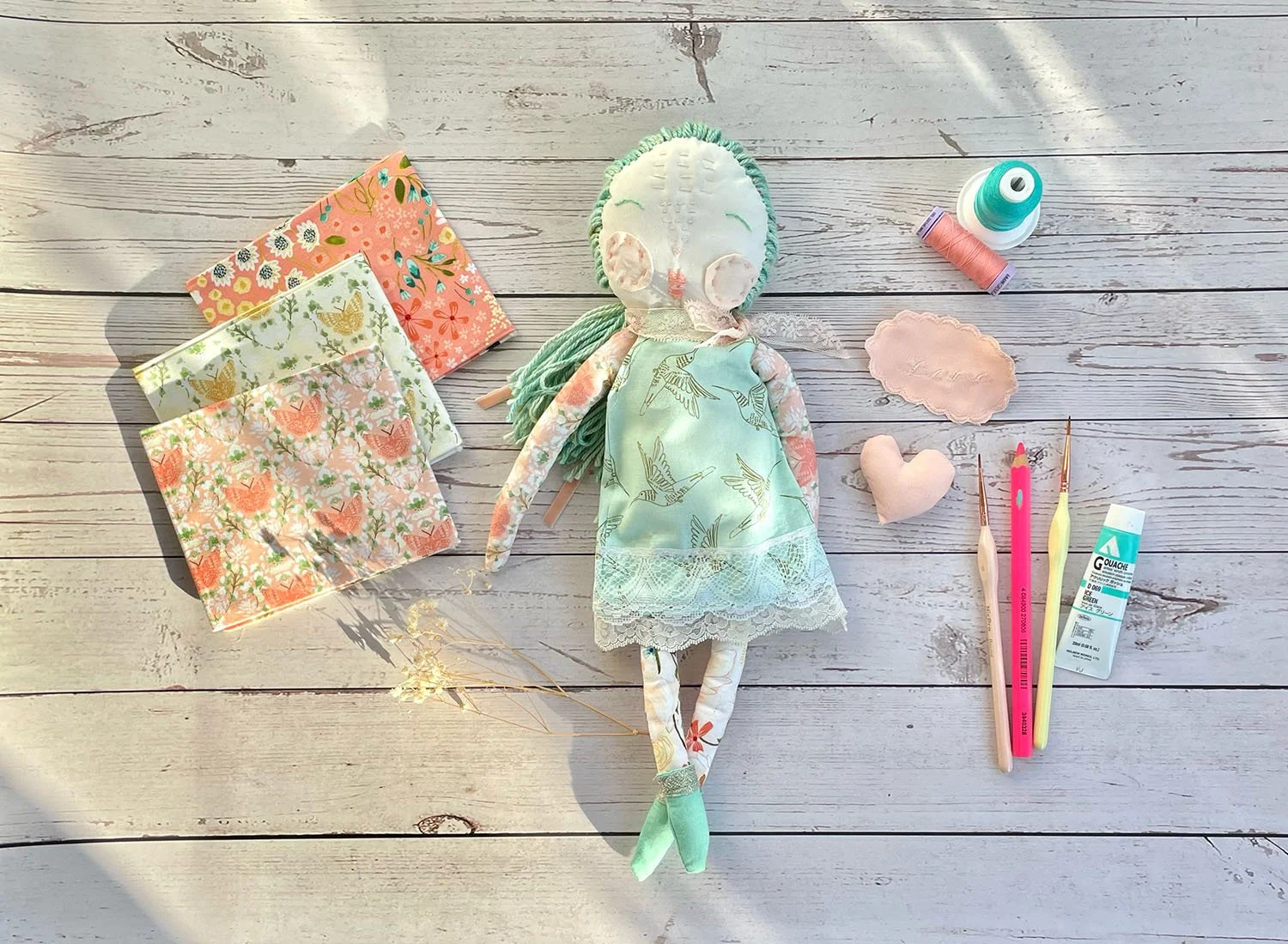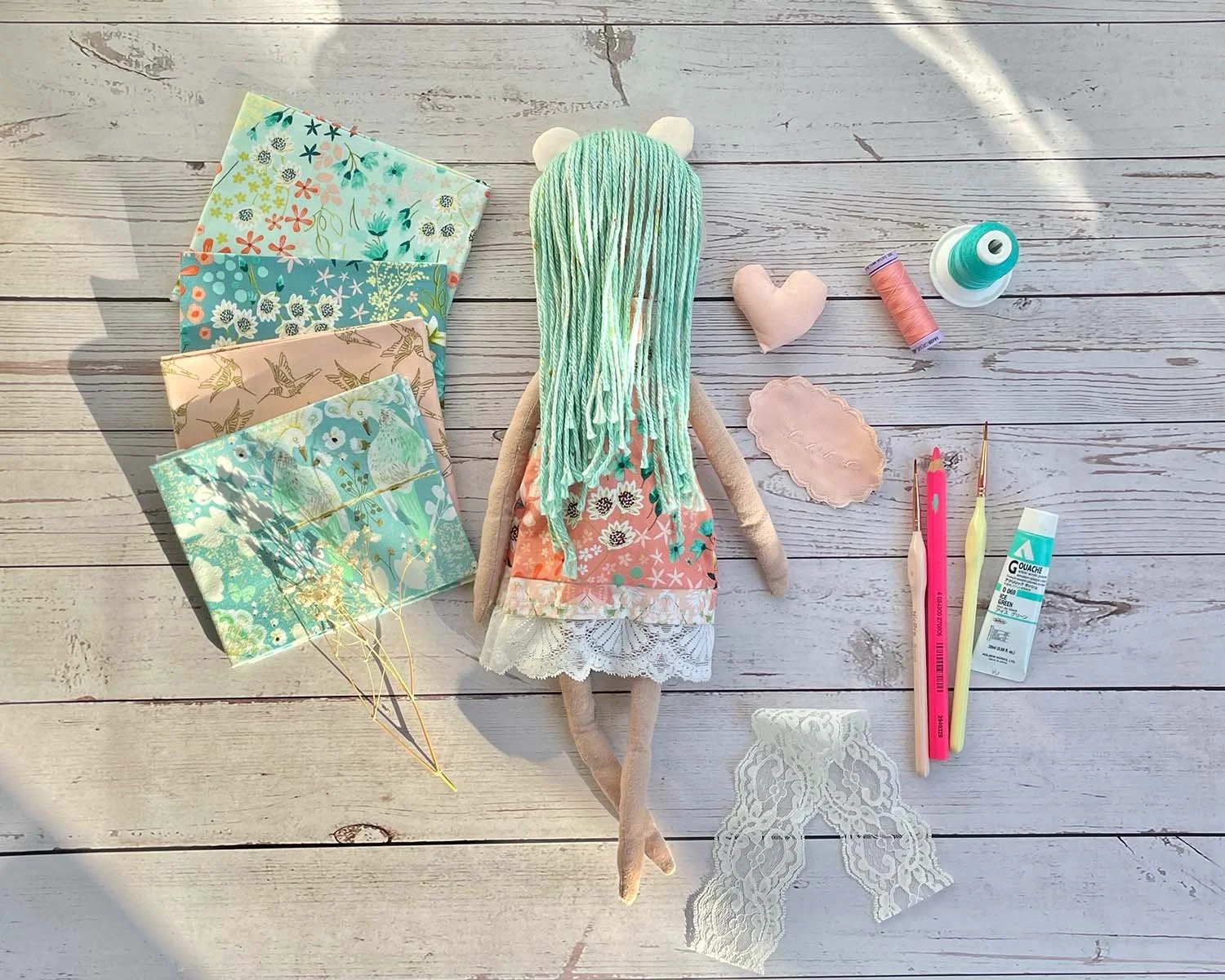 I made my first doll—Serendipity—from an old ripped duvet cover. This was an inexpensive way to dip my toes in and learn. I made her dress from samples of my Serenity Blooms Meadow Dream and Sacred Flight prints, plus some lace. I sewed her hair onto a strip of fabric, then attached the strip to her head. It’s pretty efficient, though a bit thin at the back. You can see her scalp underneath when the hair shifts. Next time I would add more rows of yarn. I gave her cute mouse ears, nesting them into her hair crown. I embroidered a simple face, and blushed her cheeks using dry artist’s Pan Pastels in red iron oxide tint. I did a simple embroidered face, which was a learning curve for me. I got better with each doll.